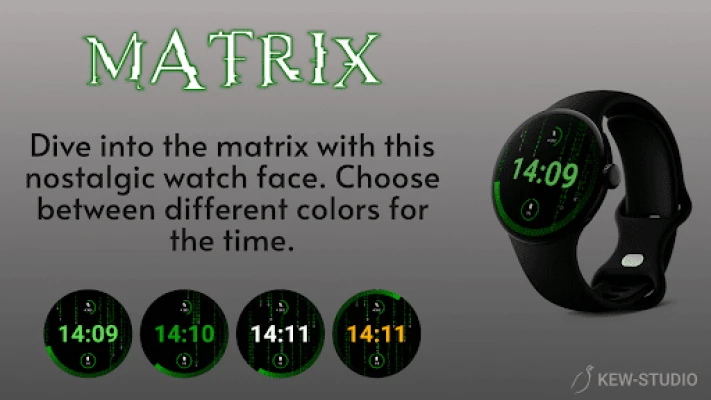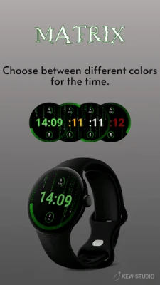 Dive into the matrix with this nostalgic watch face, inspired by the movie The Matrix. Tell the time while feeling like Neo with this watch face, the matrix rain in the background will catch eyes of everyone around. You can also choose different colors for the Time so it gets even easier to tell time.