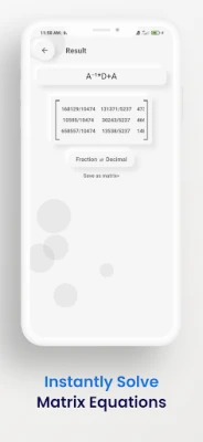 *Key Features* 1. Add matrices with custom dimensions 2. Edit rows and columns of matrices 3. Solve any kind of matrix equations 4. Matrix items support numbers, decimals, fractions and numeric equations 5. Result matrix in both decimal and fraction from 6. Create new matrix from result matrix 7. Matrices are stored into device storage 8. Pin your most required matrices at top