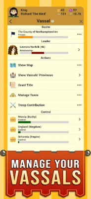 Medieval Age is the ultimate medieval simulation game, offering a blend of strategy, history, and role-playing, all in the palm of your hand. Will you be a wise diplomat, a cunning strategist, or a fierce conqueror? Rule your realm with wisdom and power, or engage in political scheming to outmaneuver your rivals.