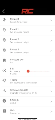 Say goodbye to the old days of airbag inflation and hello to Rough Country's Air Bag Compressor Mobile App Controller. Now, you can control your air pressure with an easy-to-use mobile app! Get accurate, convenient, and instant control of your bag settings with any Bluetooth connected device. You’ll love that you can adjust driver and passenger airbags separately or simultaneously for uneven or top-heavy loads. Plus, set 3 presets that are customizable right on your phone! Whether you have an iPhone or Android compatible phone, connecting is simple and easy. With our Mobile App Controller, you have a powerful tool to make sure your vehicle adapts on the go without any hassle!