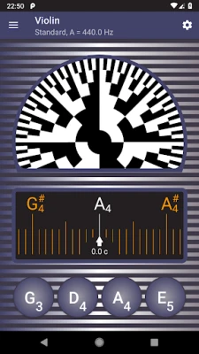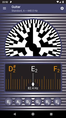 The chromatic tuner accurately detects the frequency of the tone played on your instrument, and shows it on the chromatic scale. The target strings are highlighted on the scale, and you can see how far is the tone from being in tune. When you get close enough, you can use the strobe tuner for fine tuning.